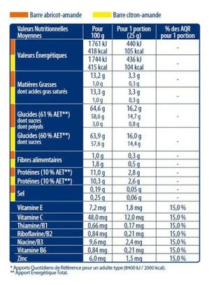 Azúcar, almendras (23.5%), albaricoques secos (15.2%) (albaricoques, harina de arroz, sulfitos ), dextrosa, Prolacta (6%) (aislado de proteína de leche nativa soluble), estabilizador (glicina), jarabe de glucosa ( bl ), arme, vitaminas (C, B3, E, B2, B6, B1), corrector de acidez (ácido málico), conservante (sorbato de potasio), gluconato de zinc, antioxidantes (extracto de romero) , tocófoles ( soja) ). Posibles trazas de gluten, marisco, pescado, huevo, lupino y lupino.