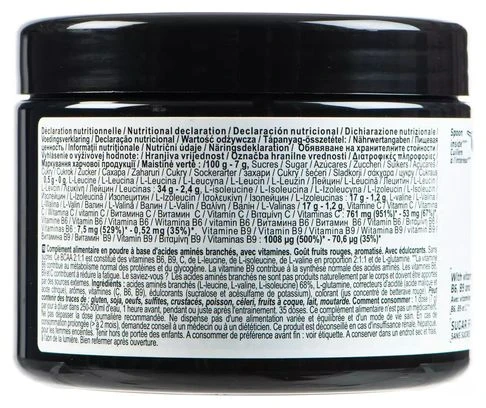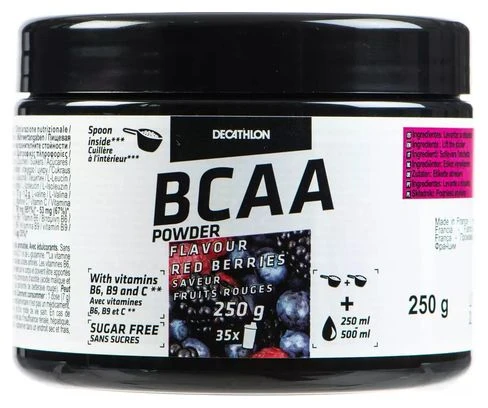 ¡La marca ha desarrollado estos BCAA para que pueda cumplir con sus entrenamientos más exigentes! Entrégate al 100%, del resto nos encargamos nosotros. Una dosis de BCAA de FRUTAS ROJAS, antes y / o durante tus entrenamientos, te aporta 4,8 g de BCAA: ¡una solución sencilla y sabrosa para complementar tu ingesta de proteínas! El + producto: COMPOSICIÓN: 4,8 g de BCAA y 1 g de glutamina por dosis REDUCCIÓN DE LA FATIGA: Contiene vitaminas B6, B9 y C ¿SABÍAS? Los aminoácidos de cadena ramificada (BCAA) no son producidos naturalmente por el cuerpo y deben ser suministrados de fuentes externas, por lo que se denominan aminoácidos esenciales. DETALLE DEL PRODUCTO Este BCAA 2: 1: 1 consta de vitaminas B6, B9, C, L-leucina, L-isoleucina, L-valina en una proporción de 2: 1: 1 y L-glutamina. La vitamina B6 contribuye al metabolismo normal de proteínas y glucógeno. La vitamina B9 contribuye a la síntesis normal de aminoácidos. Las vitaminas B6, B9 y C ayudan a reducir la fatiga. ASESORAMIENTO PARA LA PREPARACIÓN 1 dosis al día diluida en 250-500 ml de agua, 1 hora antes y / o durante el entrenamiento. Contiene 35 dosis de 7 g USO DE CONSEJOS Este complemento nutricional no es un medicamento. No exceda la dosis diaria recomendada. No exime de una dieta variada y equilibrada y un estilo de vida saludable. En caso de consumo prolongado (> 2 meses), consulte con un médico o dietista. Este producto no se recomienda en casos de insuficiencia renal o hepática para mujeres embarazadas. Mantener fuera del alcance de los niños. PESO: 0,25 kg VALOR NUTRICIONAL Declaración nutricional: 100g | Dosis de 7g Hidratos de carbono: 2,9 g | 0,2 g Azúcares: 0g | 0g L-leucina: 33,9 g | 2,37 g L-isoleucina: 17 g | 1,19 g L-valina: 17 g | 1,19 g Vitamina C: 660 mg (829%) * | 46 mg (58%) * Vitamina B6: 7,5 mg (529%) * | 0,52 mg (37%) * Vitamina B9: 1008 µg (500%) * | 70,6 µg (35%) * *% de valores nutricionales recomendados COMPOSICIÓN Complemento alimenticio en polvo a base de aminoácidos ramificados, con vitaminas. Sabor a frutos rojos. Con edulcorantes. Ingredientes: aminoácidos ramificados (L-leucina, L-valina, L-isoleucina), L-glutamina, correctores de acidez (ácido málico y ácido cítrico), aromas, vitaminas (C, B6, B9), edulcorantes (sucralosa y acesulfamo de potasio). ), colorante (jugo concentrado de remolacha). Puede contener trazas de: gluten, soja, huevos, sulfitos, crustáceos, pescado, apio, nueces, leche, mostaza.