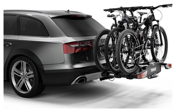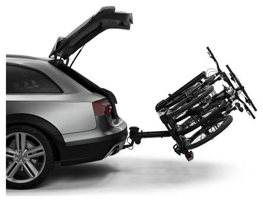 El portabicicletas montado en la barra de remolque completamente plegable, compacto y fácil de usar para todo tipo de bicicletas.